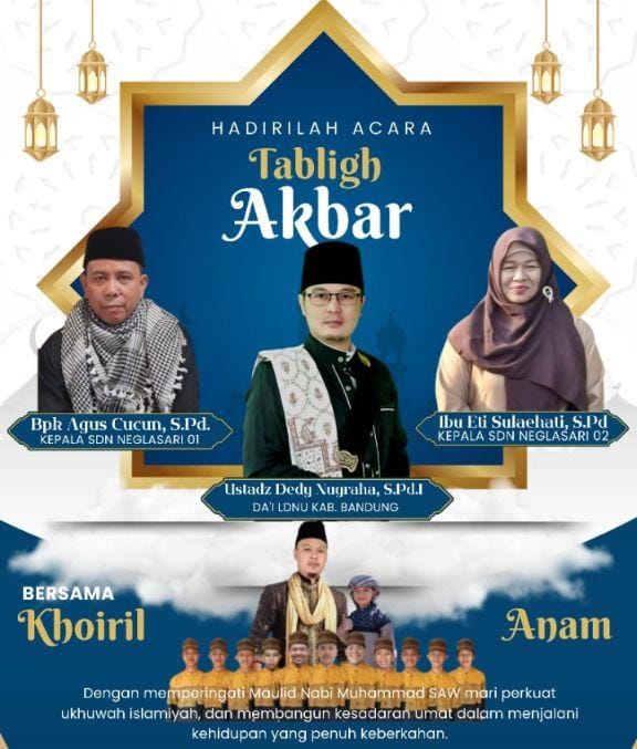 Seperti yang dilakukan SDN Neglasari 1 dan 2 Cileunyi sebagai pelaksana kegiatan kepala sekolah SDN Neglasari 1 Agus Cucun S.Pd.,dan kepala sekolah SDN Neglasari 2 Eti Sulaehati S.Pd.,serta jajaran para guru,Orang tua siswa,tokoh Agama,tokoh masyarakat serta tamu undangan lainnya,sebagai penceramah Ustadz Dedi Nugraha S.Pd.I Da’i LDNU kabupaten Bandung.Yang bertajuk ” Dengan memperingati Maulid Nabi Muhammad SAW,mari perkuat Ukhuwah Islamiyah dan membangun kesadaran umat dalam menjalani kehidupan yang penuh berkah “. Dilaksanakan di halaman SDN Neglasari 1 dan 2 Jalan Ciburial RT.02/20 desa Cileunyi kulon kecamatan Cileunyi kabupaten Bandung.Kamis 04/09/2025.