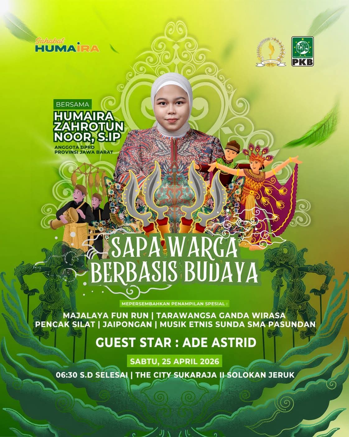 MAJALAYA – BERITASEJABAR.id – Sabtu, 25 April 2026 – Anggota Dewan Perwakilan Rakyat Daerah (DPRD) Provinsi Jawa Barat, Humaira Zahrotun Noor S.Ip. dari Komisi II Fraksi Partai Kebangkitan Bangsa (PKB), menggelar kegiatan Sapa Warga Berbasis Budaya yang meriah di kawasan The City Sukaraja 2, Kecamatan Solokan Jeruk, Kabupaten Bandung, pada hari Sabtu ini. Acara yang diselenggarakan sebagai bentuk pendekatan kepada masyarakat ini dipenuhi dengan berbagai pertunjukan kesenian tradisional yang menjadi kekayaan daerah.