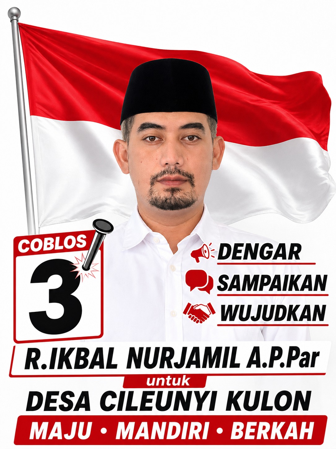 “Mari kita gunakan hak pilih ini dengan kesadaran dan tanggung jawab. Pilihlah sosok yang benar-benar berkeinginan dan memiliki kemampuan untuk mengabdi, bukan yang hanya menjanjikan hal-hal indah tanpa bukti nyata. Saya memohon doa dan dukungan dari Bapak, Ibu, serta seluruh warga sekalian, agar saya diberikan kekuatan dan kepercayaan untuk menjalankan tugas ini dengan baik. Apabila Bapak dan Ibu berkenan, berikanlah suara Anda kepada nomor urut 3 – R. Ikbal Nurjamil, A.P.P.Par,” ajaknya dengan penuh harap.